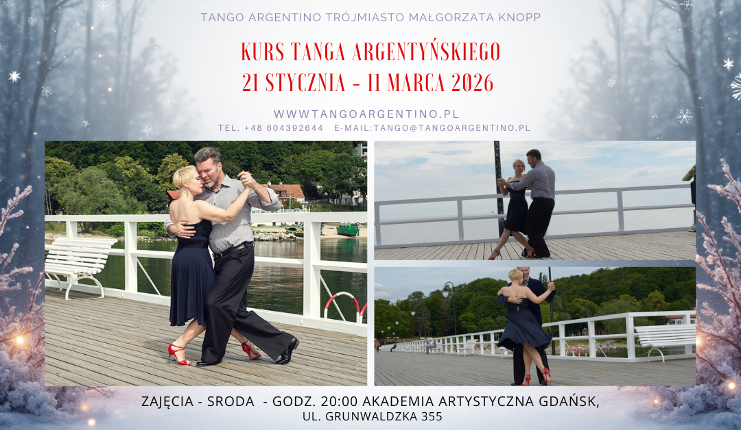 Intensywny kurs poprowadzi: właścicielka firmy Tango Argentino Trójmiasto i doświadczona nauczycielka tanga (instruktor tanga od 20 lat) – Małgorzata Knopp Zapisy i informacja : zapisy do 11 stycznia 2026 – Małgorzata Knopp tel. 604 392 644 lub mail : tango@tangoargentino.pl